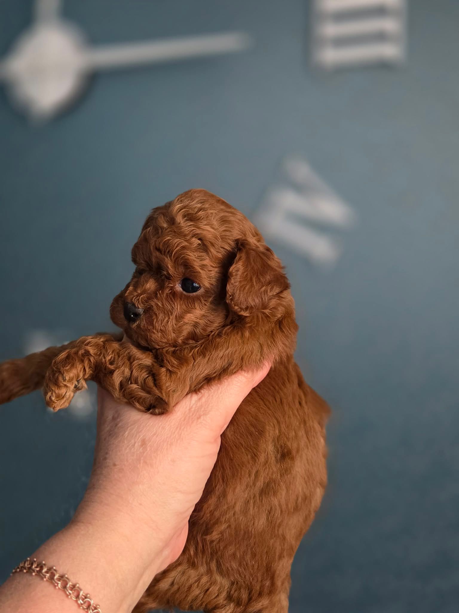 Gael is een bijzonder mooi Toy Poodle mannetje met een diepe rode kleur en een elegante uitstraling.
